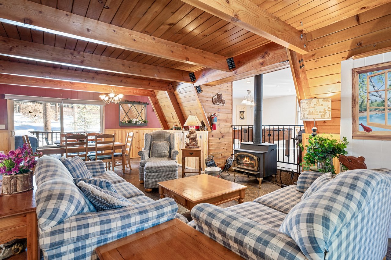 This custom home with an A-frame heart has beautiful wood-beam ceilings throughout, for a rustic, mountain-chalet vibe perfect for your Big Bear stay. A two-sided living room, one with sofas and a wood stove for conversation and the other with a TV and the adjoining dining room, lets your guests sort themselves by preferred activity. The dining room looks out of sliding doors to the back deck and yard which includes a convenient doggy door to the back deck/yard, a dining table, and barbecue for al fresco meals, and a horseshoe pit for after-dinner fun. A homey, fully equipped kitchen makes eating in a snap; you will love the convenient breakfast table for quick snacks. Just beyond the living room is a spacious game room, with a pool, foosball, and card tables, plus a TV for happy lounging.