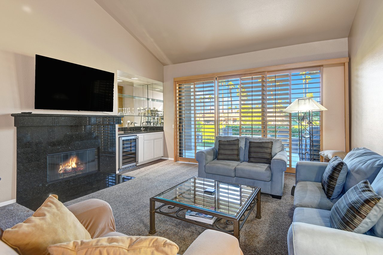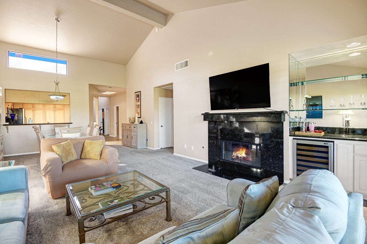 The large, open floor plan is beautifully furnished and thoughtfully designed for both relaxation and entertaining. Highlights include a remodeled kitchen with stainless steel appliances and granite countertops, newly tiled floors, a marble fireplace, full wet bar with wine fridge, custom paint, ceiling fans throughout, plantation shutters, and an enclosed private patio.