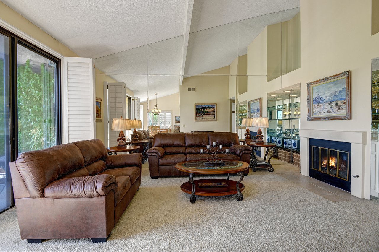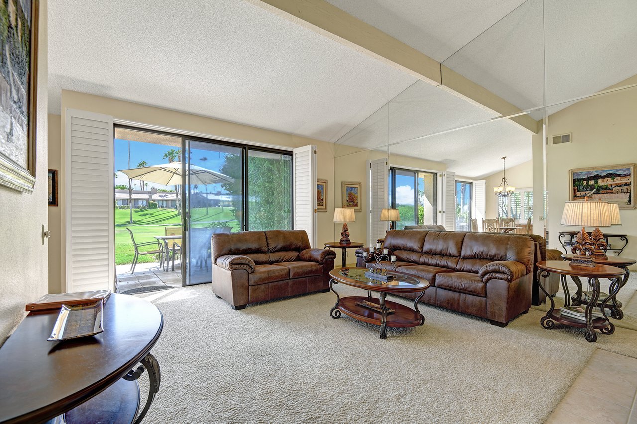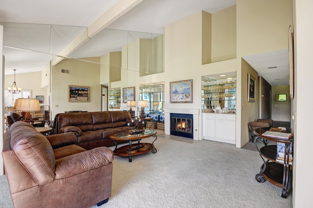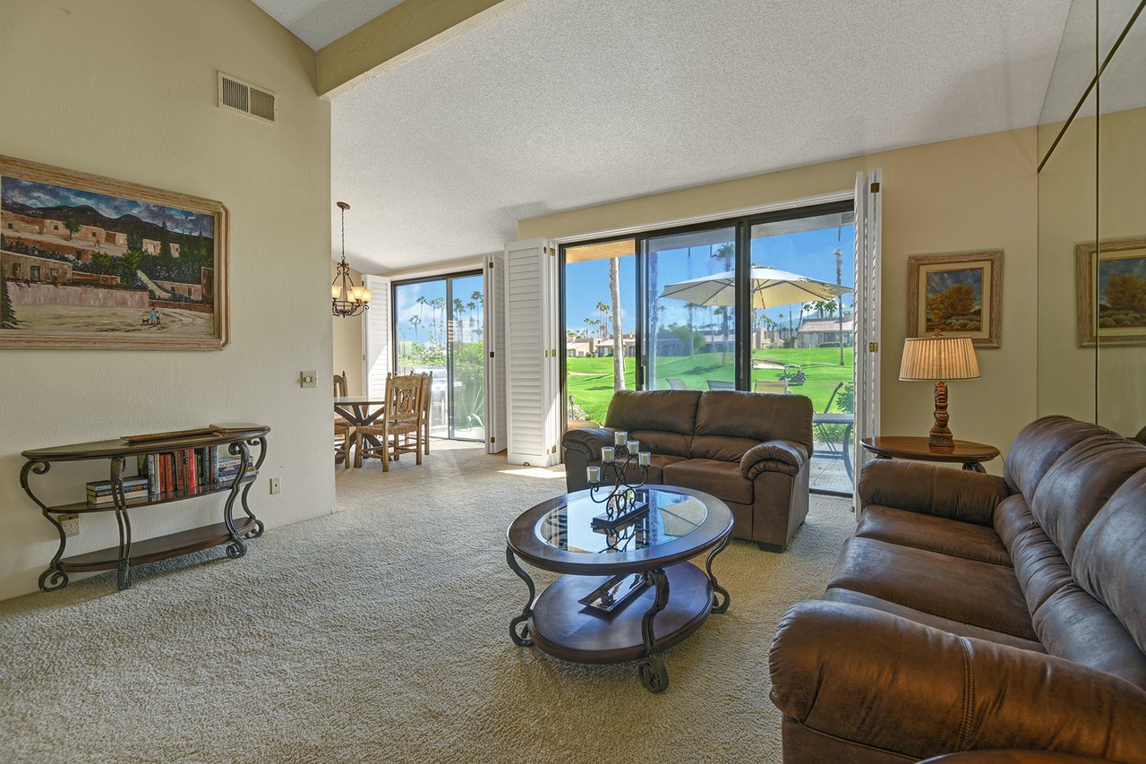 The open living area features two comfortable sofas, a convenient wet bar, and sweeping fairway views—ideal for relaxing or entertaining. The remodeled kitchen opens to the dining and living space, making it easy to enjoy time together.