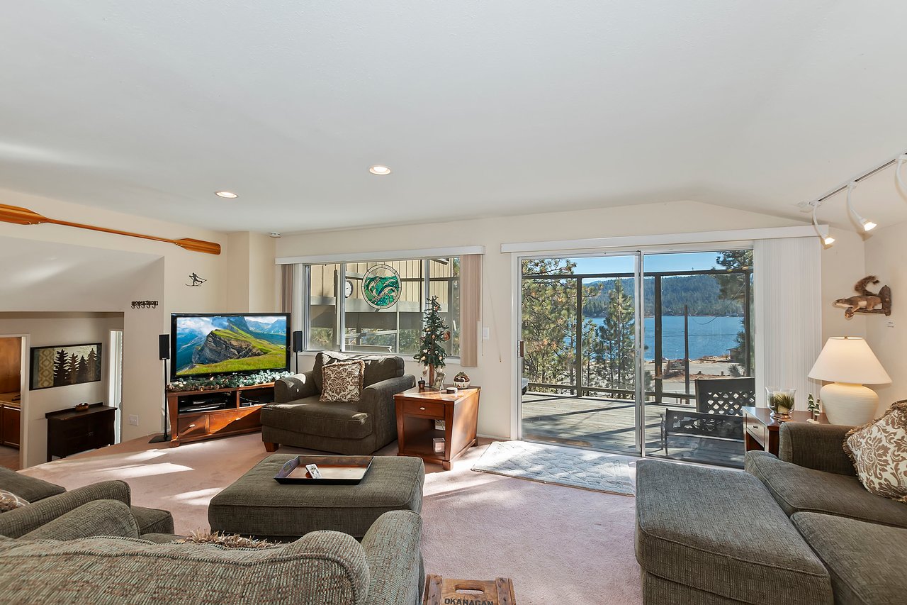 The open living area is the heart of the home, providing the perfect space to unwind after a long day on the forest trails or enjoying #lakelife. Lounge on large, comfy couches while watching your favorite shows on the flat-screen TV equipped with cable and Apple TV. Step out onto the deck to savor your morning coffee or enjoy a sunset cocktail, all while taking in unobstructed views of the lake.