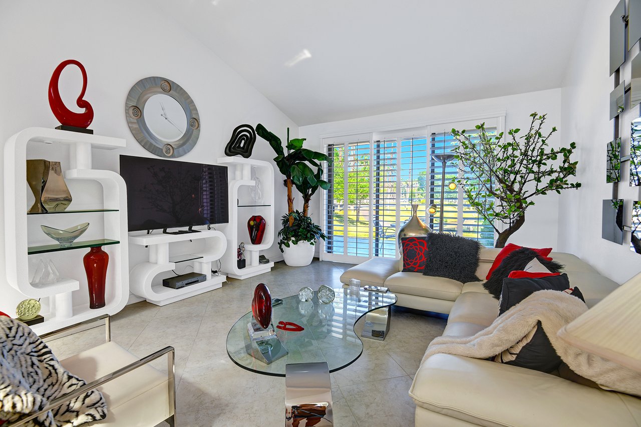 Step inside to a bright and open living space with contemporary furnishings and floor-to-ceiling windows that fill the home with natural light. The living room features a comfortable sectional and large flat-screen TV, while the adjacent dining area is ideal for meals or planning your day in the desert.