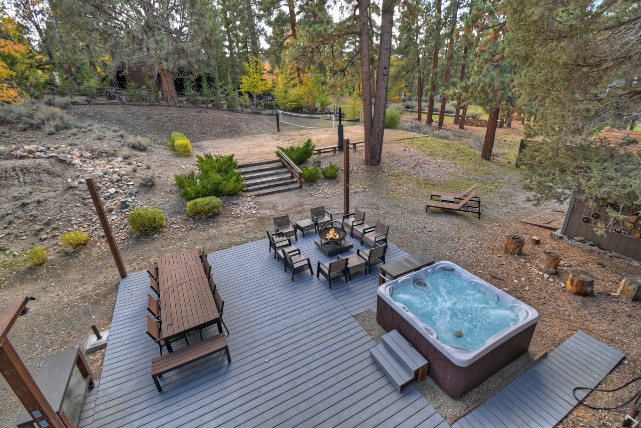 Step outside to enjoy an expansive deck and backyard featuring an outdoor dining and seating area, BBQ and gas fire pit, all nestled within the towering ponderosa pines.