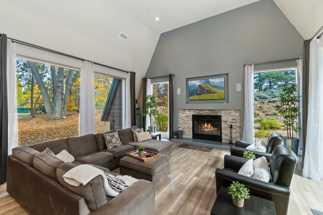 Inside, the open-concept living area features vaulted ceilings and tall windows, filling the space with natural light. Comfortable seating arrangements will allow your group to relax around the wood burning fire place, while streaming your favorite shows on the large flat screen.