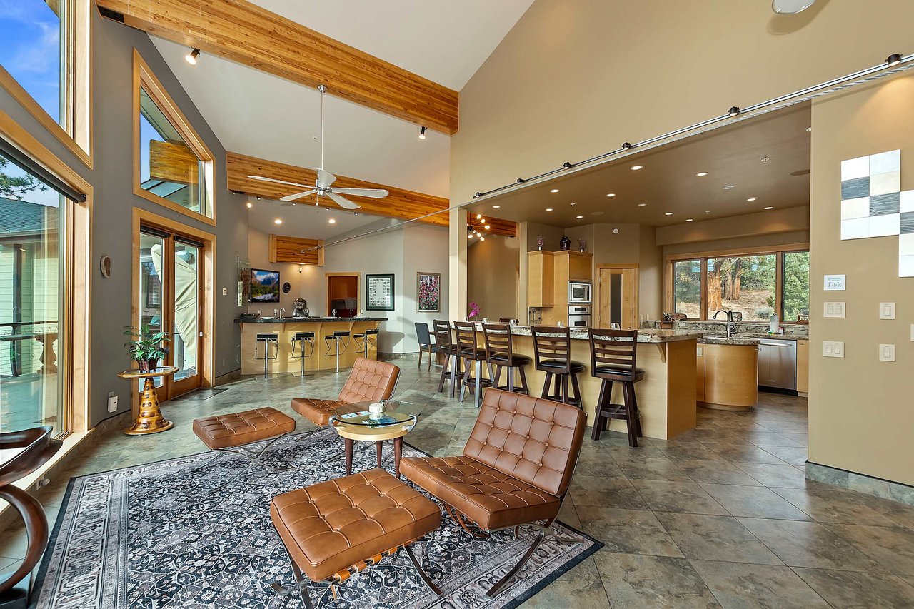 Ascend the spiral staircase to a grand living area featuring vaulted wood-beam ceilings and floor-to-ceiling windows that showcase panoramic Lake and Slope views. A gas fireplace adds warmth and charm, setting the perfect scene for relaxing with an après-ski cocktail as you watch the snow fall outside.
