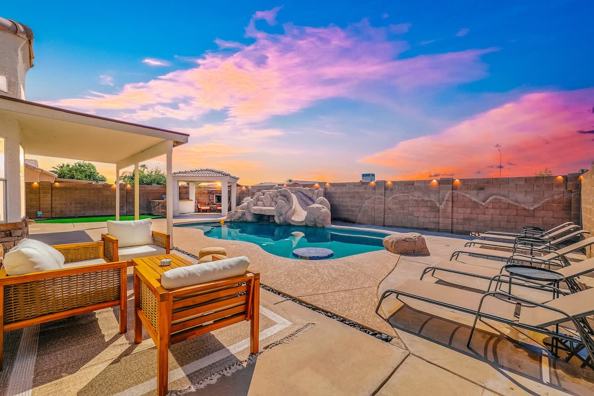 Outside, you'll find a maintained, private, and drought resistant backyard. Here you’ll find a sparkling pool, BBQ, pizza oven, and cozy gazebo-covered seating area, perfect for entertaining groups of friends or a family night in. Once you’re hoping to explore the town, you’ll be happy to know travel time to restaurants, bars and shops are only 3-10 minutes away from our home base! If you’re flying in/out, the Phoenix airport is less than a 30 minute drive. No matter the reason you’re traveling through Mesa, our standout home is the perfect choice for a comfortable, lavish, and practical stay!