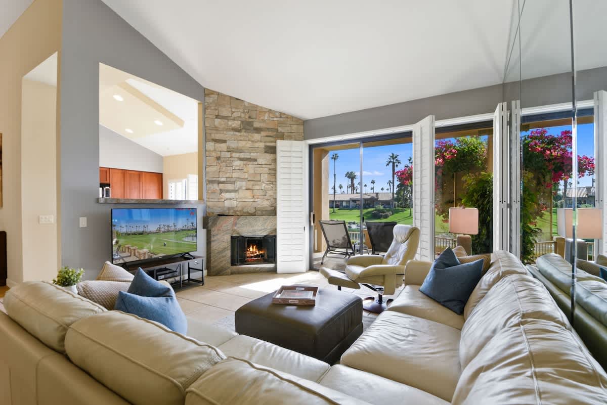 Located in the beautiful Palm Valley Country Club, this is the perfect Palm Desert getaway. The view from the patio is spectacular, with dozens of palm trees, a meticulously manicured golf course, a beautiful lake, and majestic mountains. With two remodeled bedrooms and baths, and all the trimmings, just bring your clothes and you'll be all set The kitchen features stainless steel appliances, as well as a gas stove. You can enjoy a coffee or tea in the kitchen while taking in your breathtaking view. You'll love the spacious living and dining rooms, especially in the winter with your fireplace and hot beverage during those cold winter nights. The two bedrooms feature remodeled showers and baths, new vanities, sinks, lighting fixtures, and granite counters. Book today for your own personal desert oasis.