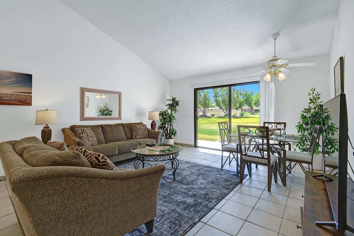 Tradition Model - 1BR/1BA approx. 821 sq. ft. Your private patio is just steps away from a sparkling pool and spa! This nice light and bright condo offers high ceilings, comfortable furnishings, well equipped kitchen and FREE long distance with wi-fi internet access. There are TVs in the living room and bedroom. Easy walking distance to the clubhouse.