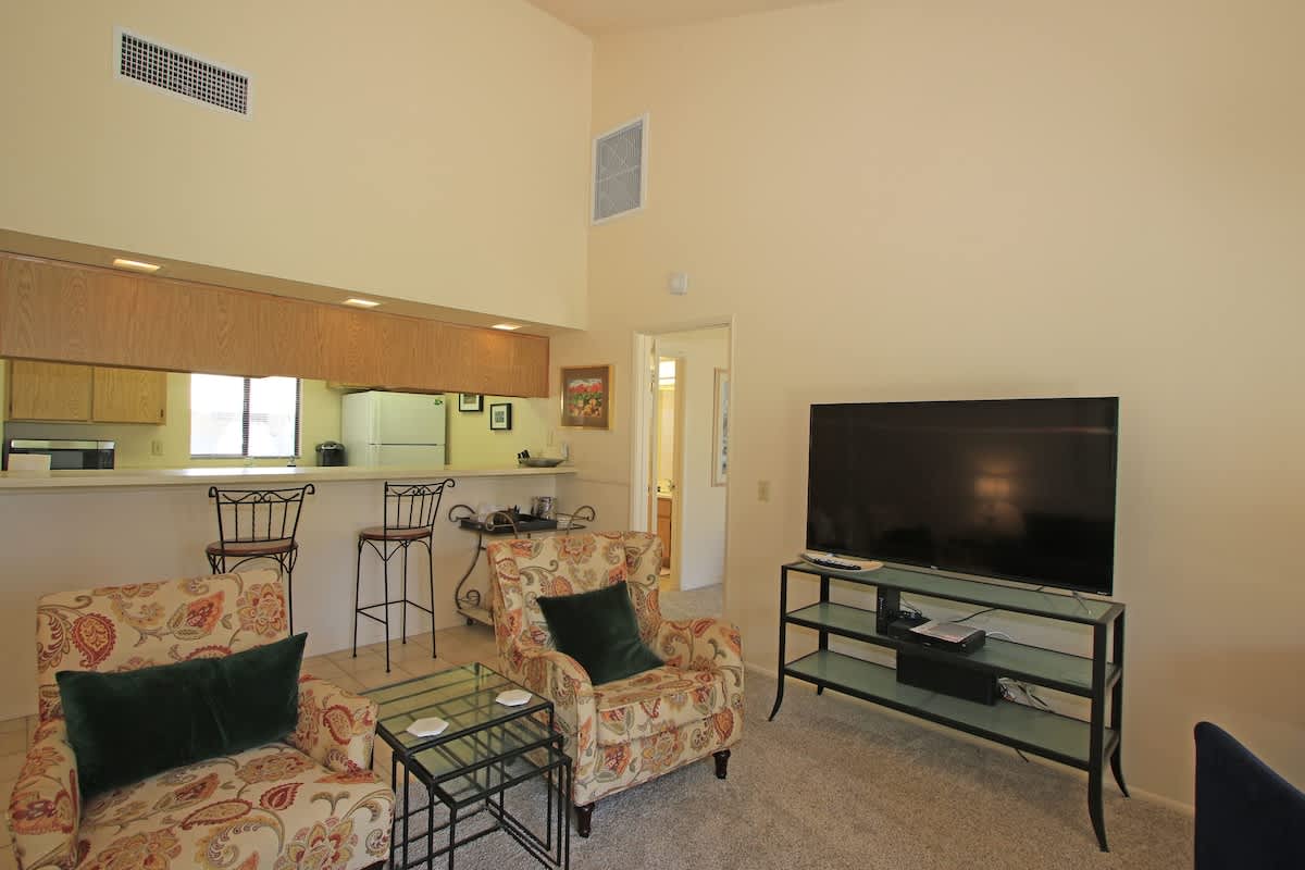 This home features two primary-style suites, both thoughtfully furnished for comfort, along with a fully equipped kitchen and high ceilings throughout. Entertainment is easy with TVs in the living room and both bedrooms. Additional conveniences include a walk-in shower, large closets, and a drive-up carport attached to the property.