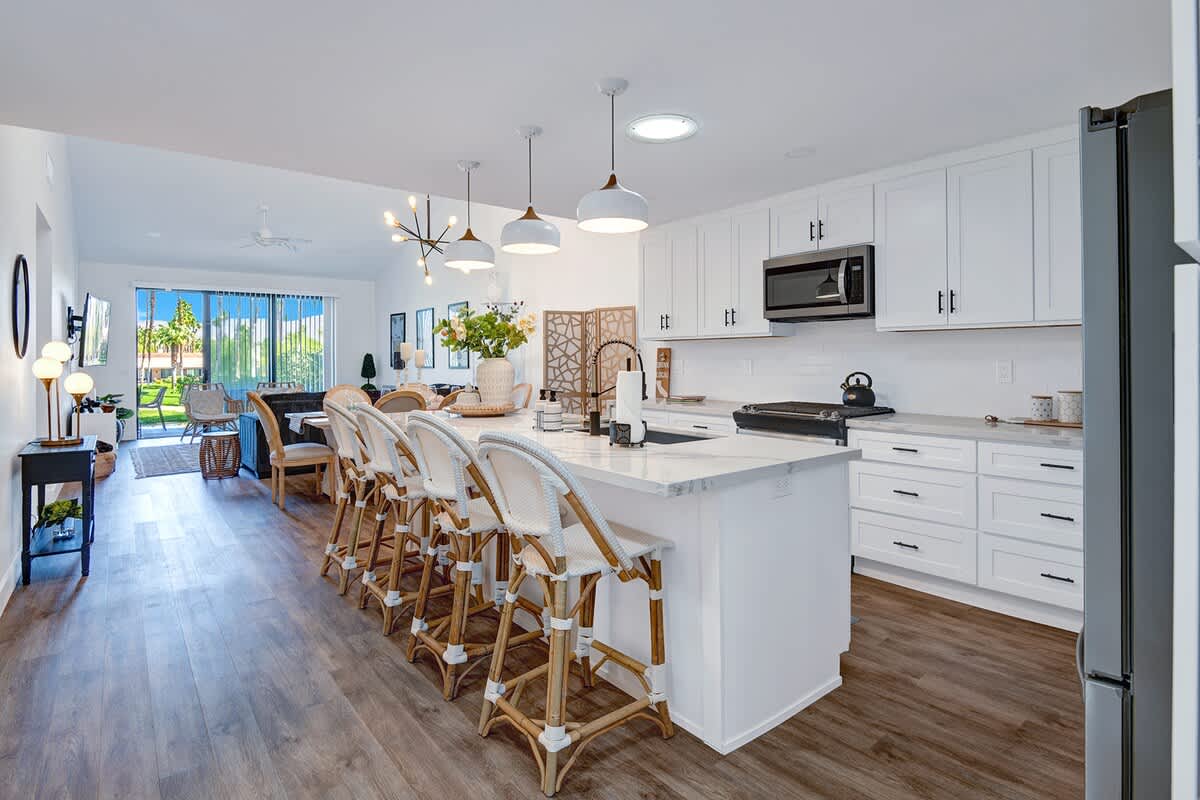 Beautiful three bedroom, two bath +bonus room Palm floor plan with approx. 1547 square feet. This condominium is completely remodeled and upgraded. The spacious floor plan offers an open floor plan, high ceilings and lovely new furnishings to make your stay enjoyable and relaxing. There are flat screen TVs in the living room, primary bedroom and both guest bedrooms. The kitchen is well equipped for entertaining guests. There is a front courtyard and the patio overlooks the fairway and mountains as you enjoy afternoon sunset. The community pool / spa are a short walk. We invite you to view the pictures on line, they are absolutely how you will find this property when you walk through the front door.