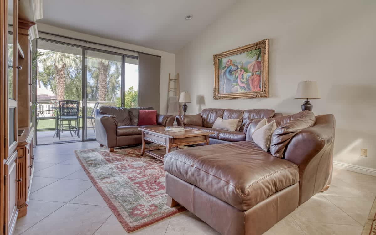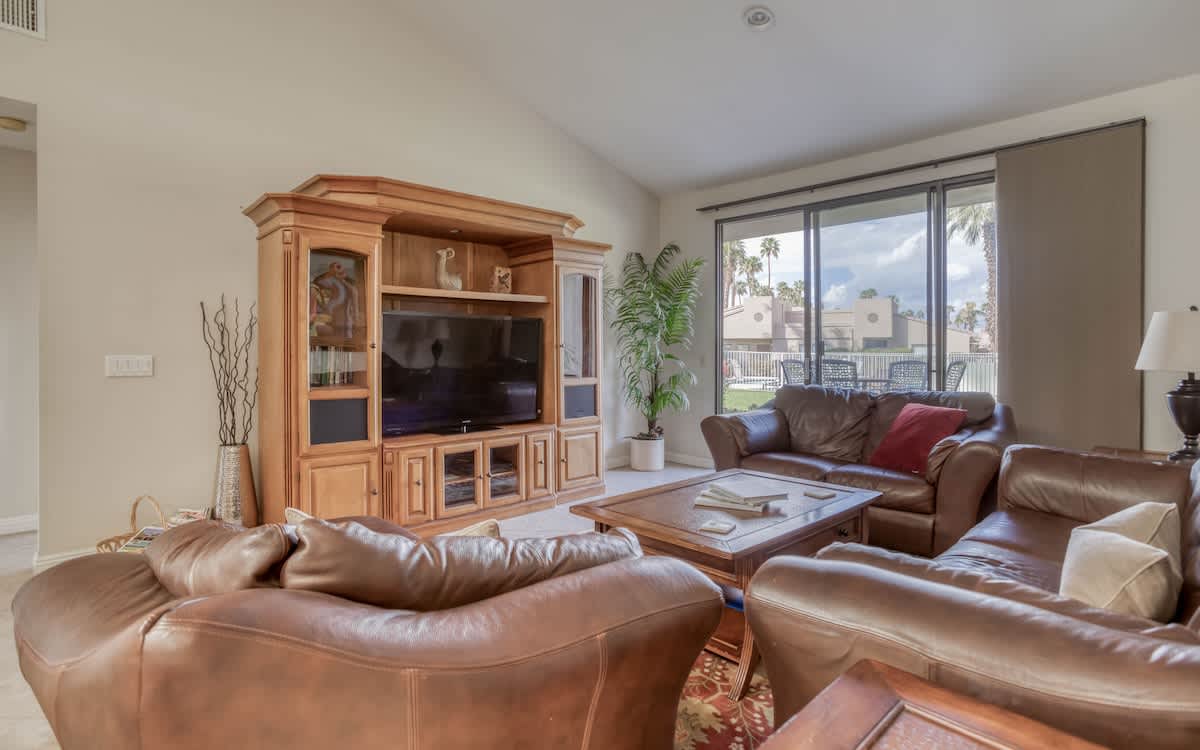 This newly remodeled condo showcases a modern kitchen and bathrooms, along with new tile flooring throughout and light, contemporary décor that perfectly complements the desert surroundings. The spacious living area offers comfortable seating, flat-screen TVs in the living room and both bedrooms, and seamless access to the patio for enjoying morning coffee or evening cocktails.