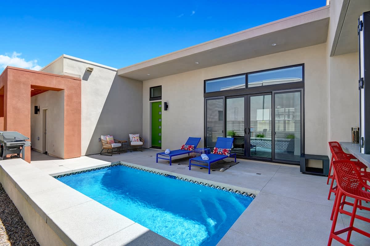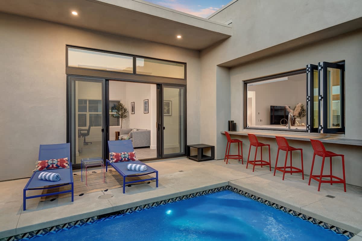 Enter the courtyard gate and you're welcomed by your own private, pool (aka spa-pool, a pool that can be heated and jetted up to a relaxing spa experience). You will enjoy poolside lounge seating for taking in the sun and Palm Springs lifestyle.