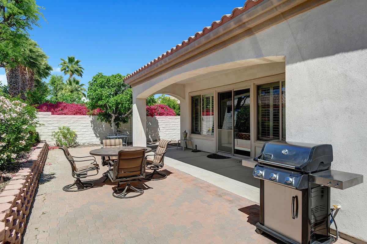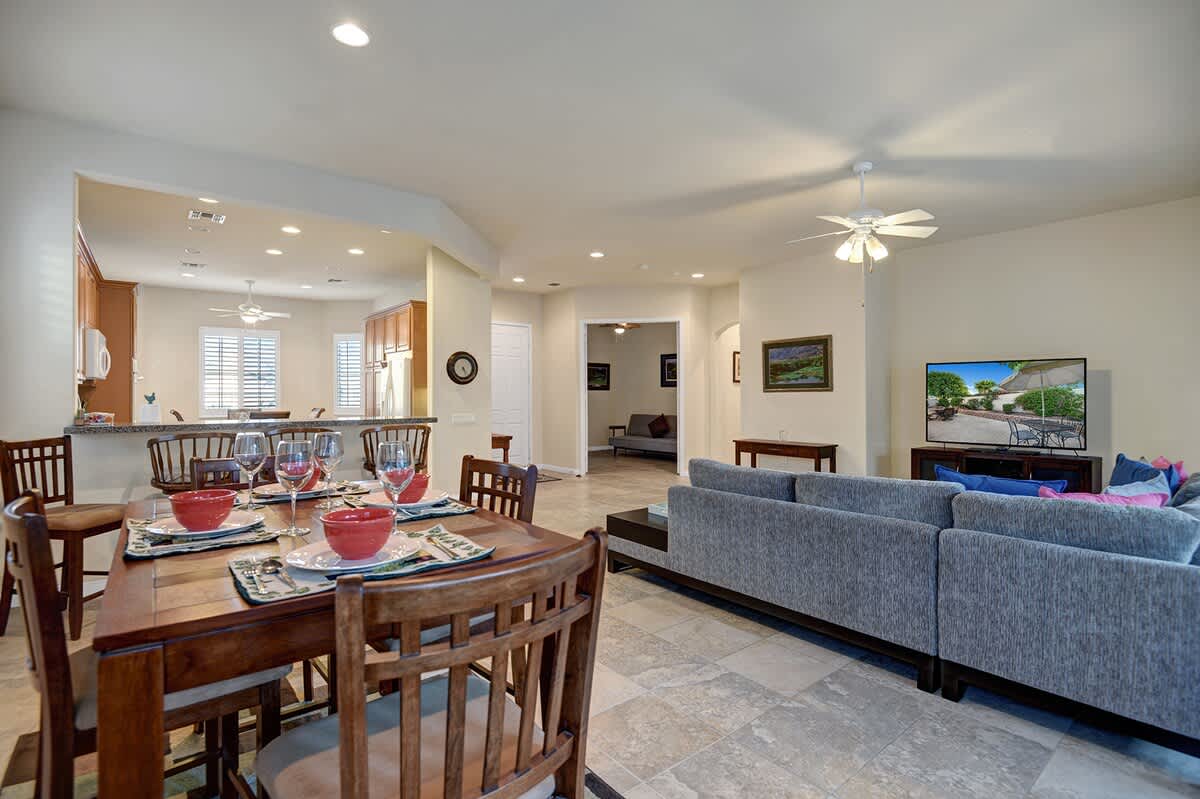 The huge living area features a sectional sofa, flat-screen TV, and dining area. Guests will appreciate the outdoor dining patio. There is also a full-size laundry room and a 2-car garage.
