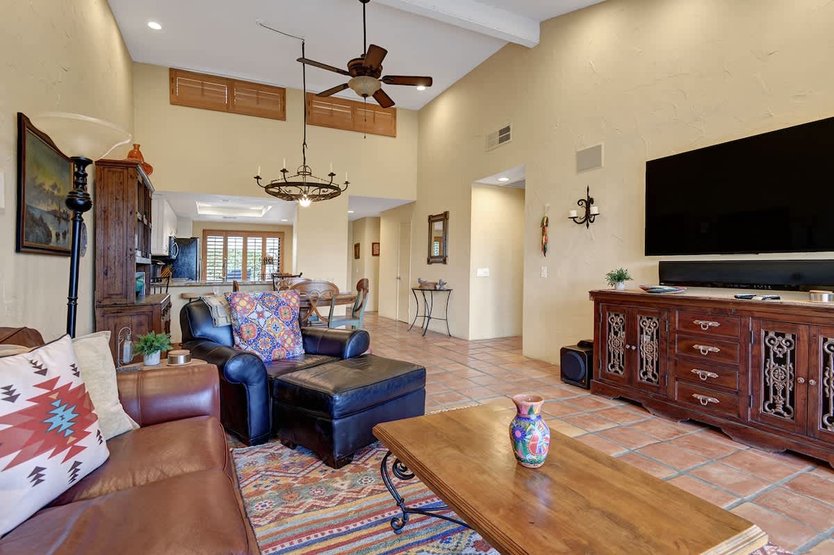 Relax in the gated interior courtyard complete with a fire pit and BBQ, or step out to the back patio to take in the fairway views and sunshine. Enjoy your favorite shows on flat-screen TVs in both bedrooms and the living room, and take advantage of the washer and dryer and double-car garage for added convenience.