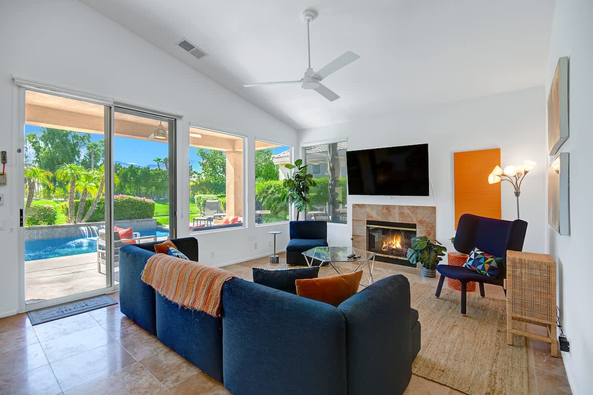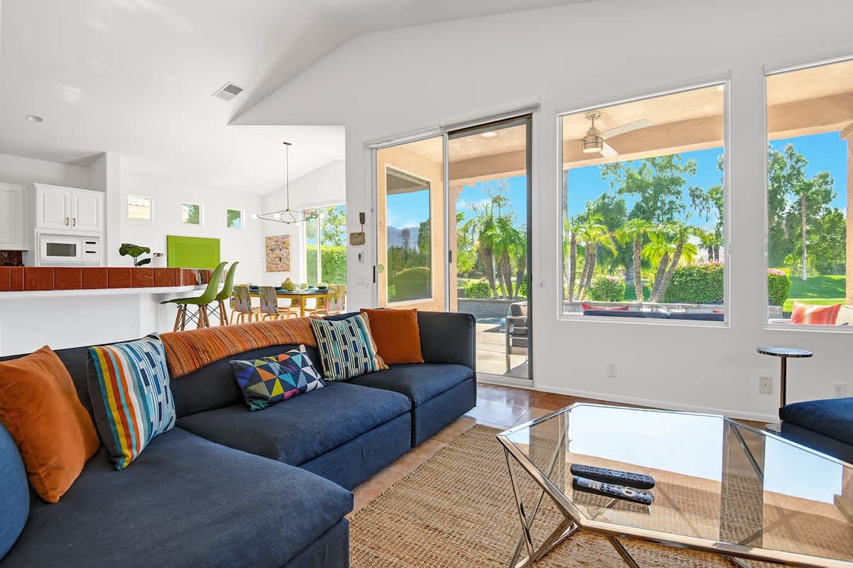 The open floorplan is perfect for entertaining and gathering with a lovely light-filled living room with beautiful furnishings, fireplace and flatscreen TV. Cheery and bright with colored tiles and palm tree views, the cook in the group will love preparing meals in the fully equipped kitchen. Enjoy a casual meal at the counter or gather around the sleek dining table that seats 6 and recount the days adventures.