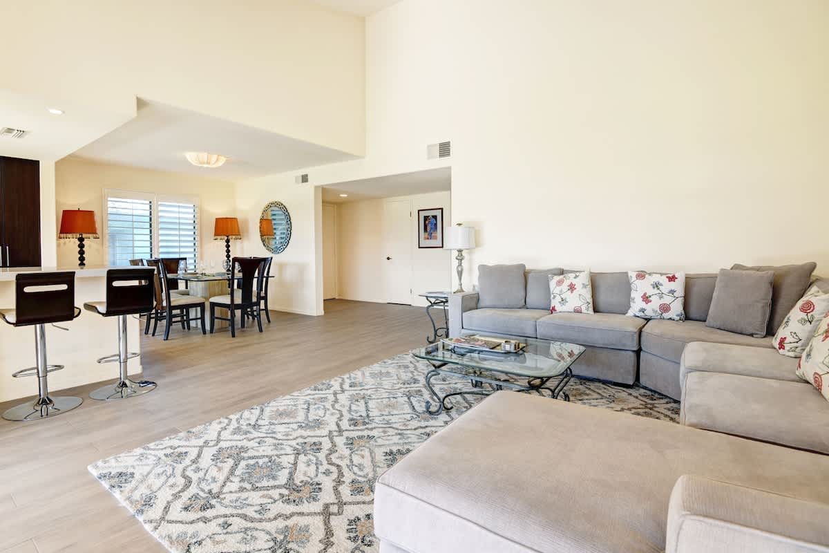 Unwind in the living room on a plush sectional couch, watch a show on the flatscreen TV, or explore the deserts night skies with the telescope. A sliding glass door opens to the patio, blending indoor and outdoor living.