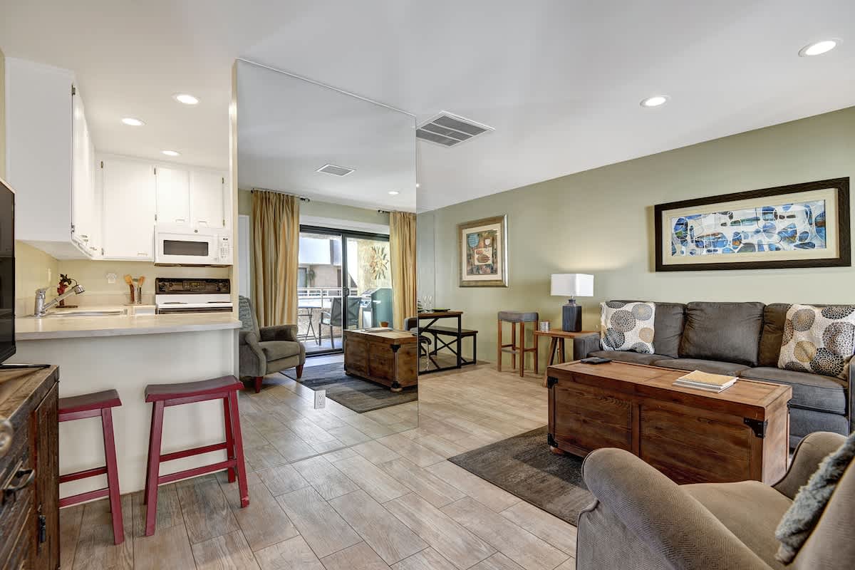 Welcome to your Palm Springs getaway in the desirable gated community of Biarritz. This stylish 1-bedroom, 1-bath condo offers the perfect blend of comfort, convenience, and resort-style living—all just minutes from downtown. Bright and thoughtfully furnished, the space features an open floor plan with large windows that fill the home with natural light. The living area opens to a private balcony where you can enjoy your morning coffee or evening cocktail while taking in the mountain views.