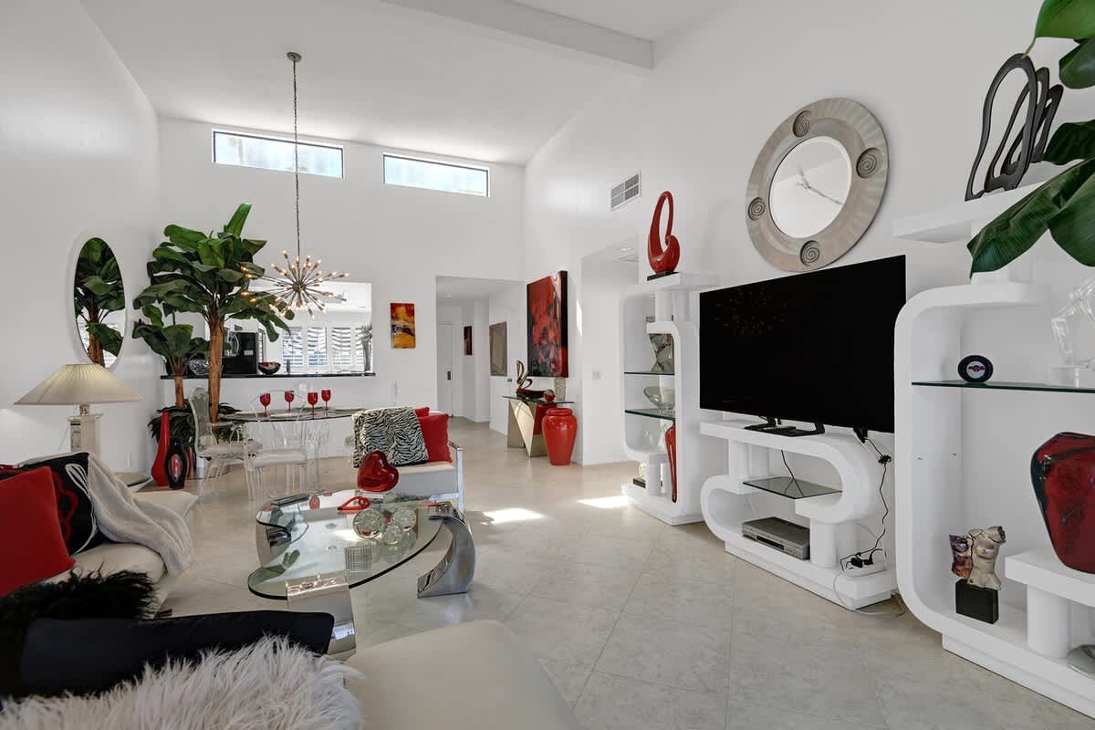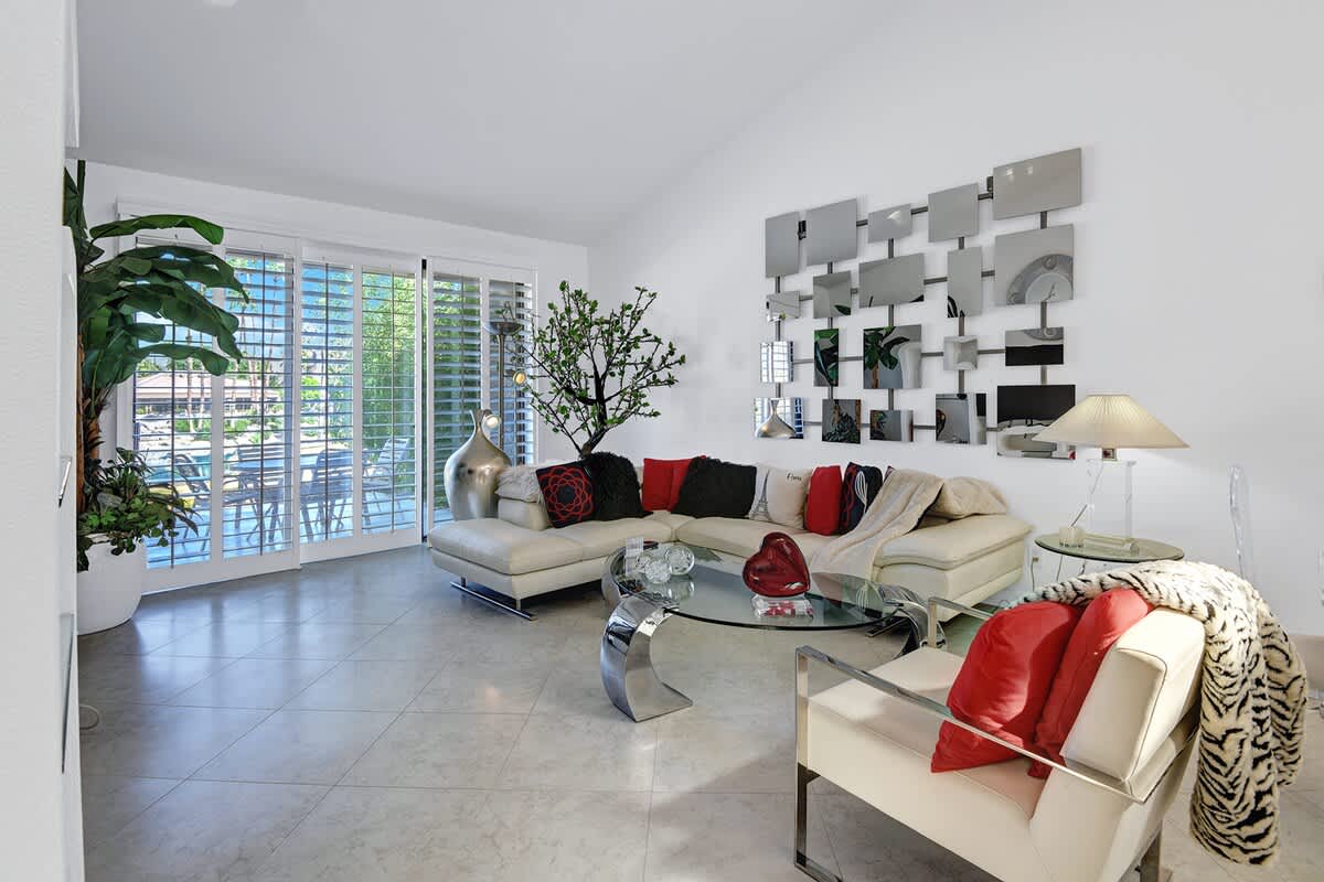 Step inside to a bright and open living space with contemporary furnishings and floor-to-ceiling windows that fill the home with natural light. The living room features a comfortable sectional and large flat-screen TV, while the adjacent dining area is ideal for meals or planning your day in the desert.