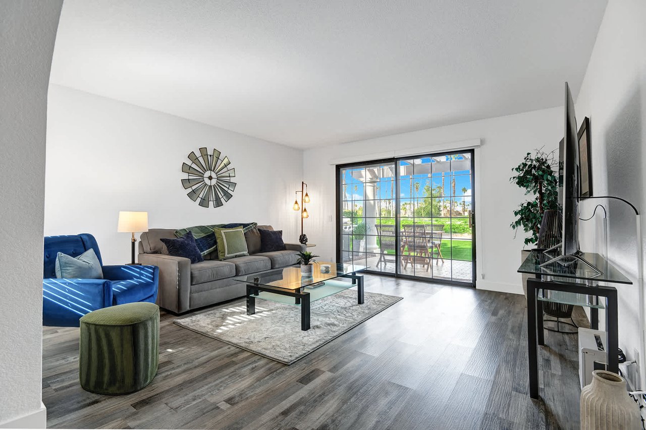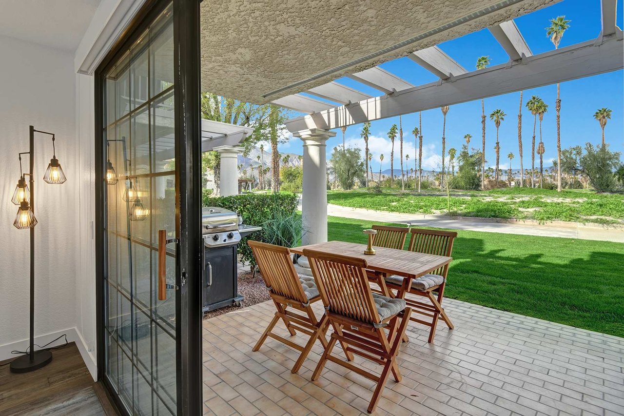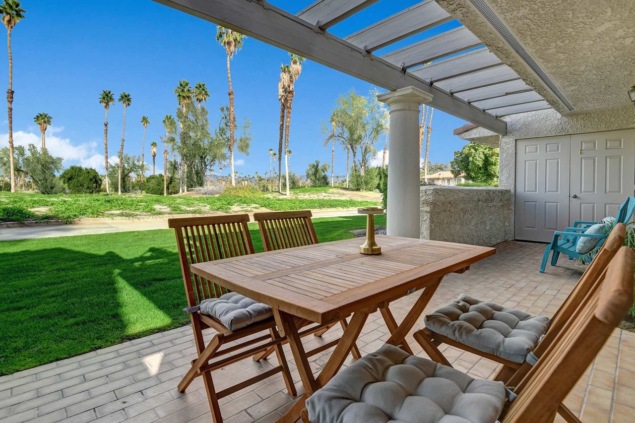 Welcome to your Palm Springs getaway in the desirable Mesquite Country Club community. This beautifully maintained condo offers a bright, open layout designed for comfort and relaxation. The living space is filled with natural light and flows seamlessly into a fully equipped kitchen, making it ideal for both quiet mornings and easy entertaining. Step outside to your private patio and enjoy the peaceful desert setting, perfect for morning coffee or evening cocktails.